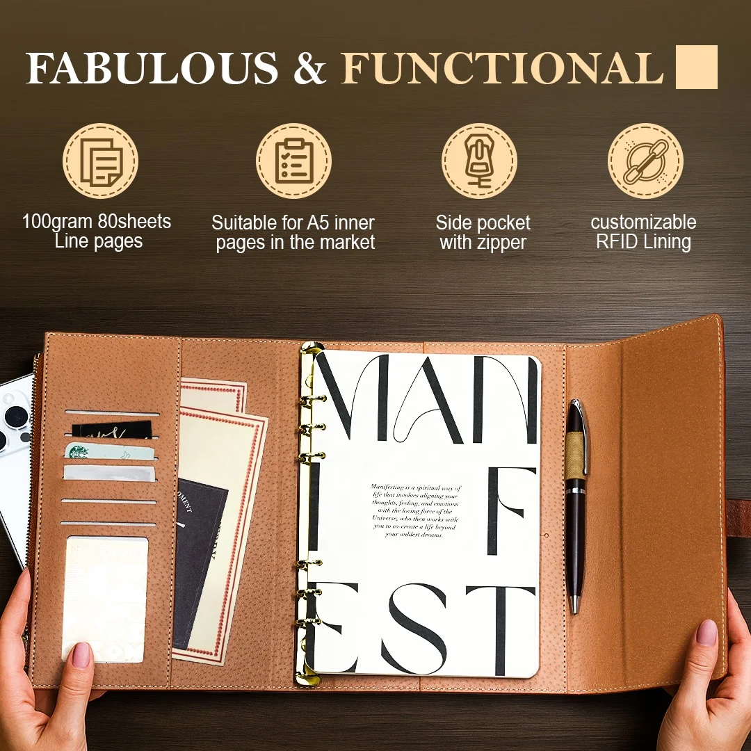 Exclusive Ring Binder A5 Pu Leather Loose Leaf Organizer Diary Custom logo Planner 6 Rings Journal Notebook with Zipper Pocket