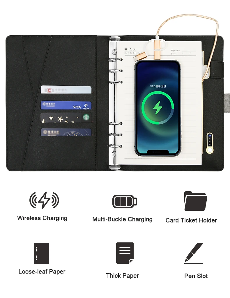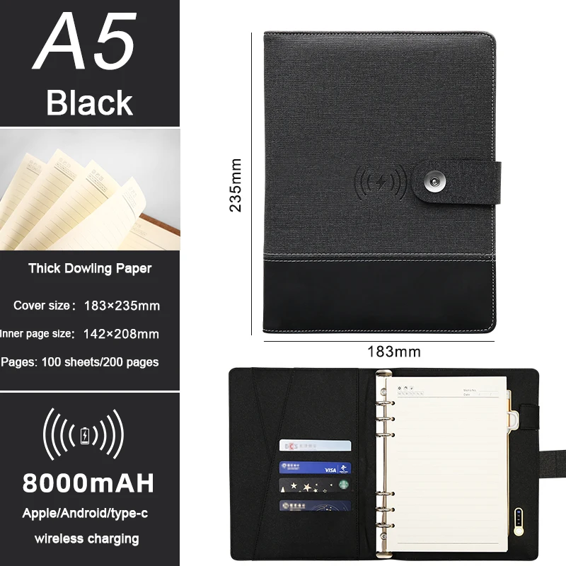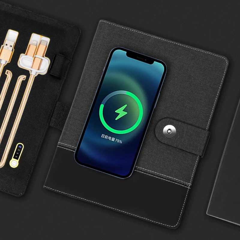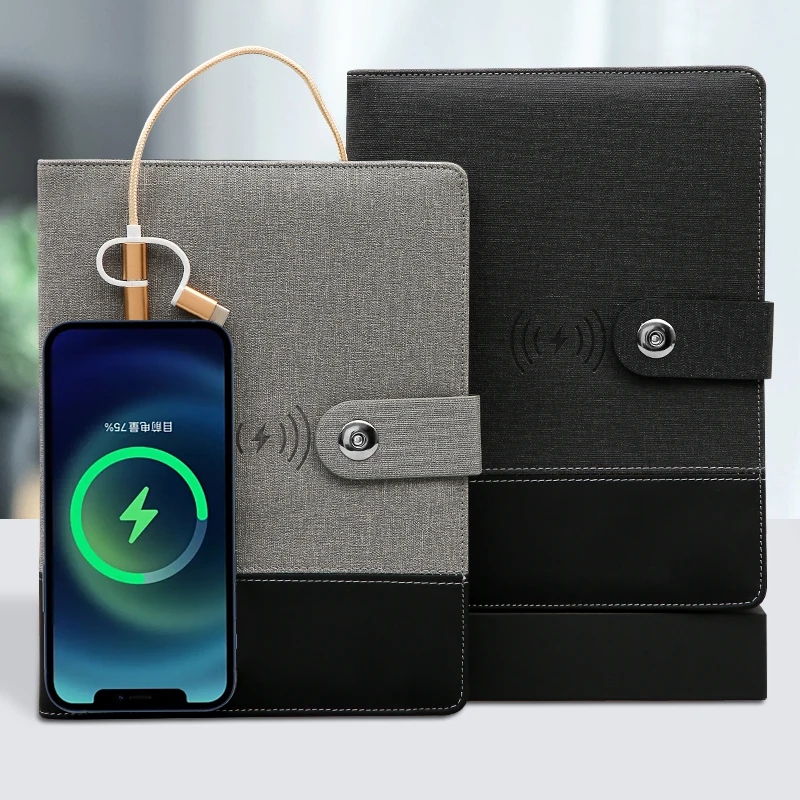 Wholesale Custom Logo Fabric PU Leather A5 Charging Notepad 8000mAH Iphone Android Type-C Wireless Charging Notebook