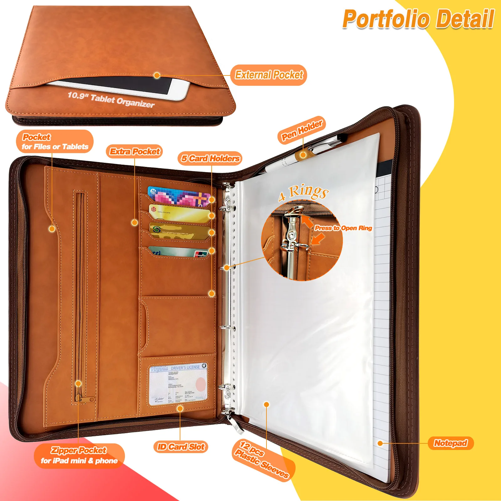 Leading Supplier Padfolio Organizer Case A4 PU Leather Document Compendium Ring Binder File Folder Zippered Portfolio