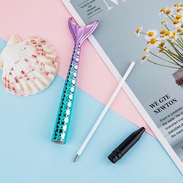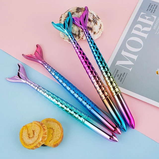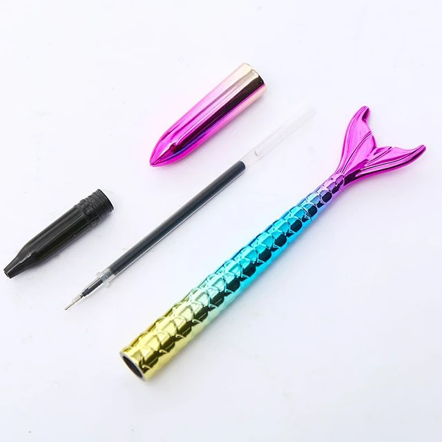 Wholesale Rainbow Shiny Novelty Mermaid Shaped Ballpoint Pen Black Plastic Stationery Gift for Kids Office Promotion