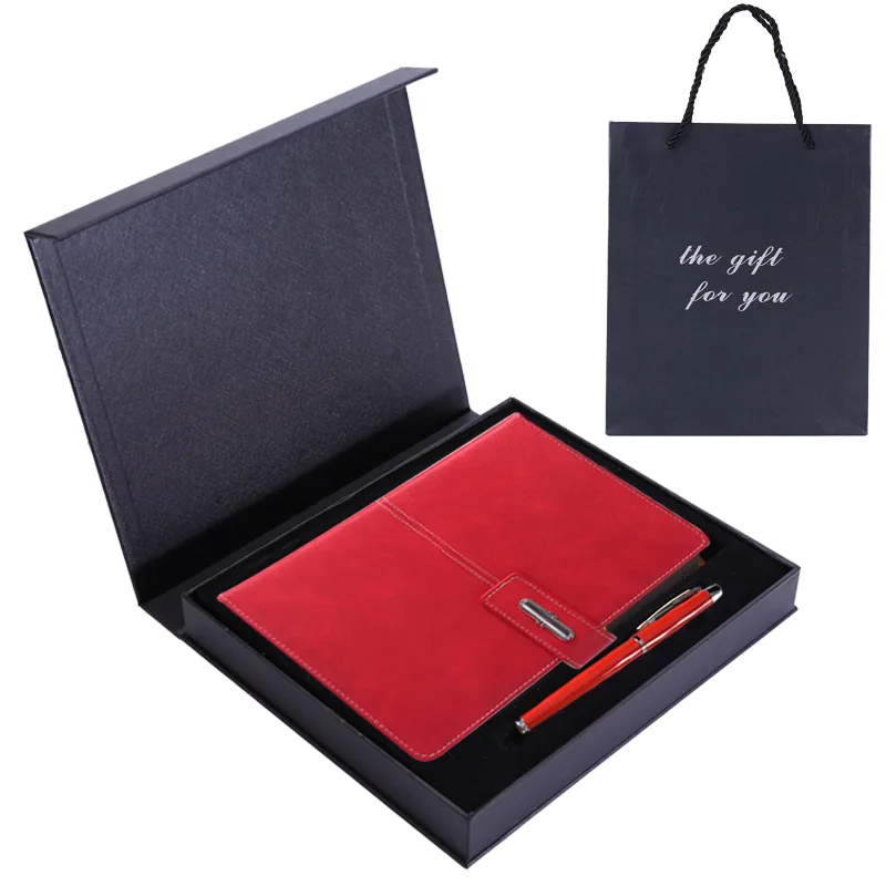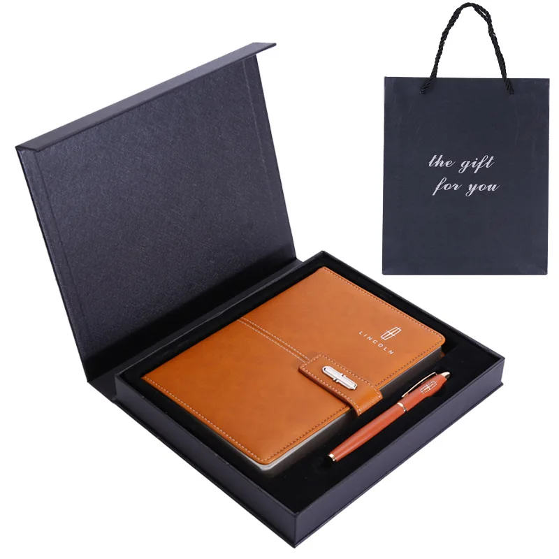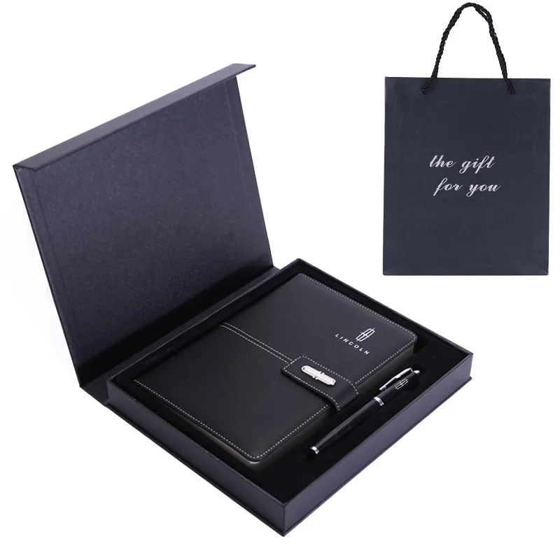 Custom Luxury Refillable Notebook Gift Set With Box Paper Bag Office Journal Set A5 Black PU Leather Magnetic Journal With Pen