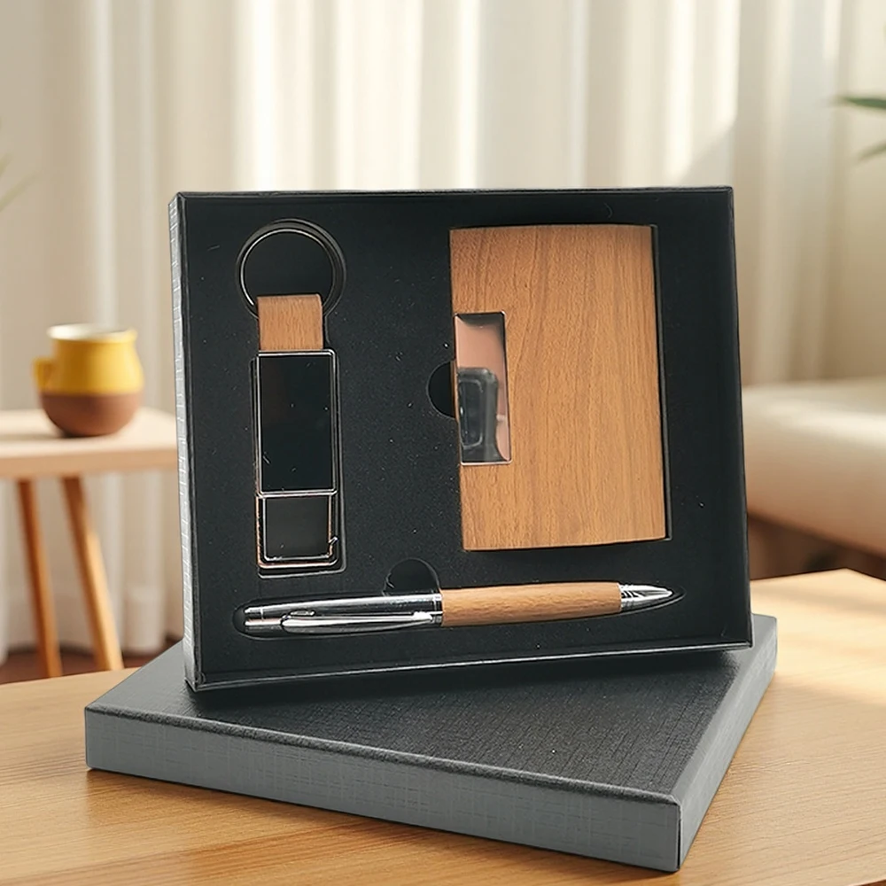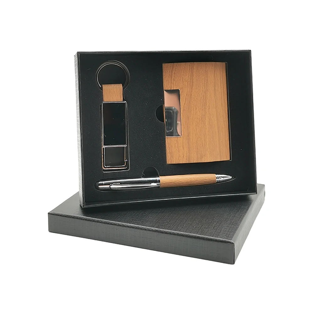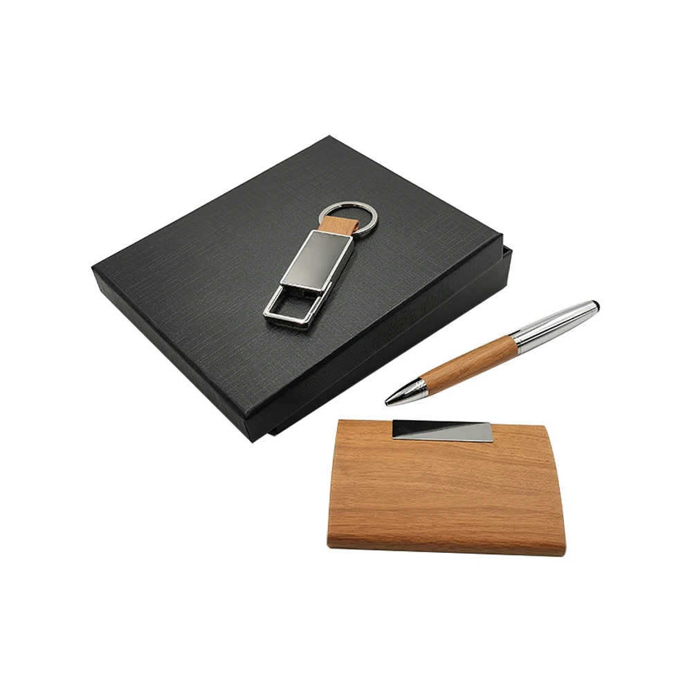 Custom Logo Business Cardholder Pen Keychain Gift Set Promotional Corporate Personalization Metal Wooden for Giveaways